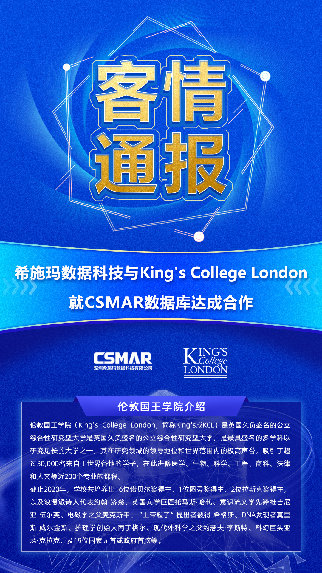 【客情转达】betway西汉姆官网公司与King's College London就CSMAR数据库告竣合作