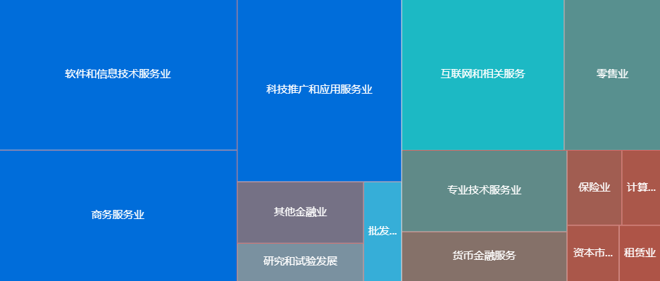 图2展示了以《国民经济行业分类》(GB/T 4754-2017)划分的中国金融科技公司行业分类情形。。。。。。。如图所示,,,,,,“软件和信息手艺服务业”、“商务服务业”、“科技推广和应用服务业”的金融科技公司数目占总数的3/4以上,,,,,,可见以金融信息服务、企业金融服务类型为代表的金融科技公司正迅速生长、壮大。。。。。。。