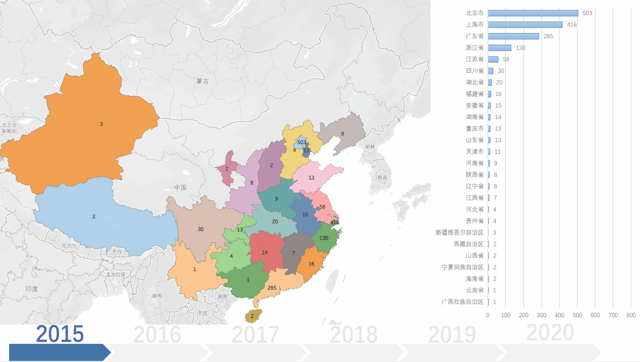 图1展示了2015-2020年中国金融科技公司生长情形。。。。。。。从图中可以看出,,,,,,金融科技公司的数目一连增添,,,,,,自2015年到2020年,,,,,,金融科技公司数目从1577家增添到2342家,,,,,,其中,,,,,,注册地在北京、上海、广东的公司数目一直坚持在前三。。。。。。。近年来随着各地政府相继出台相关工业支持政策,,,,,,至2020年,,,,,,各地金融科技公司陆续注册建设,,,,,,金融科技的生长浪潮险些延伸到天下各地,,,,,,说明各地的相关工业支持政策均获得差别水平的响应。。。。。。。