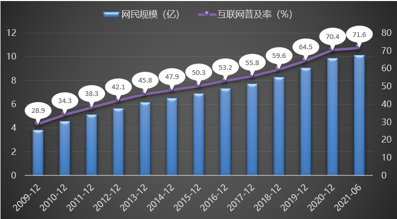 图3展示了2009-2021年天下网民规模及互联网普及率转变情形,,,,,,,,从图中可以看出,,,,,,,,阻止 2021年6月,,,,,,,,我国网民总体规模凌驾10亿,,,,,,,,重大的网民规模为推动我国经济高质量生长提供强盛内生动力,,,,,,,,加速我国数字新基建建设、买通海内大循环、增进数字政府服务水平提升。。。。。。