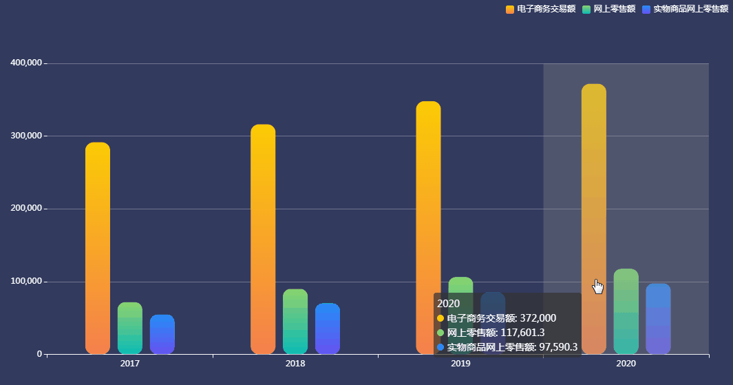 该图展示了2017-2020年天下电子商务生意额情形,,,,,,,,天下电子商务生意额逐年递增。。。。。。2020年,,,,,,,,天下电子商务生意额37.2万亿元,,,,,,,,网上零售额1.18万亿元,,,,,,,,其中实物商品网上零售额9.76万亿元,,,,,,,,增添14.8%,,,,,,,,占社会消耗品零售总额的24.9%,,,,,,,,我国数字化消耗潜力重大,,,,,,,,生长迅速。。。。。。