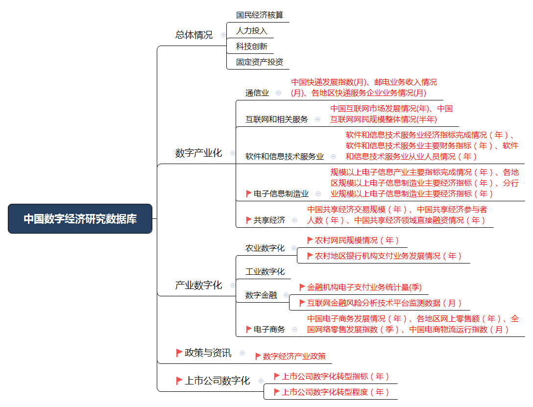 CSMAR数字经济研究数据库提供经济生长总体情形(国民经济核算、人力投入、科技立异、牢靠资产投资)、数字工业化(通讯业、互联网和相关服务、软件和信息手艺服务业、电子信息制造业、共享经济)、工业数字化(农业数字化、工业数字化、数字金融、电子商务)、政策与资讯及上市公司数字化数据。。。。。。