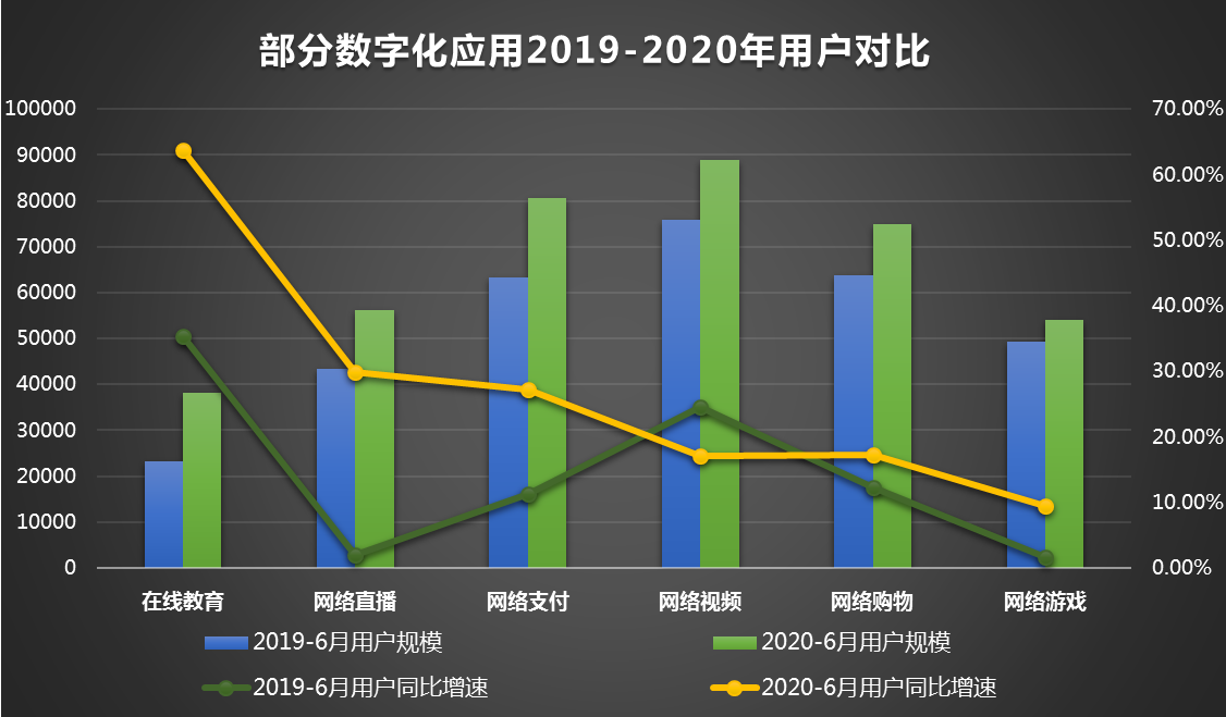 图4展示了2019-2020年,,,,,,,,在生涯领域,,,,,,,,部分数字化应用的用户规模及同比增速情形。。。。。。2020年上半年,,,,,,,,出于疫情防控需要,,,,,,,,经济运动加速向线上迁徙,,,,,,,,人民必需居家完成事情、教育、饮食、娱乐等运动,,,,,,,,在线教育、网络直播、网络支付、网络购物、网络游戏用户同比增速均快于2019年上半年。。。。。。新冠疫情在极短时间内引发了数字化新需求,,,,,,,,推动数字化转型跨越式生长。。。。。。