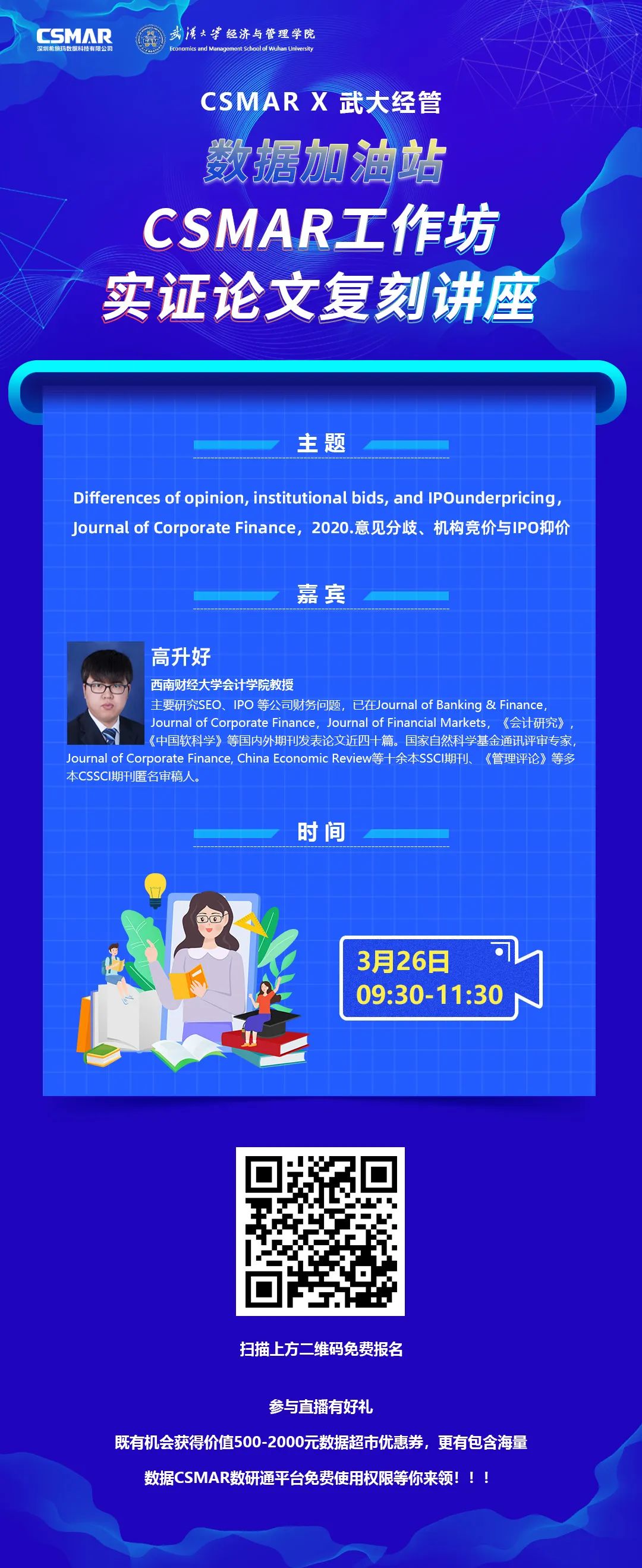 2022年3月19日上午9:30,,,,,CSMAR事情坊实证论文复刻讲座第一讲准期开讲。。。。。。。本次讲座由武汉大学经济与管理学院团结betway西汉姆官网举行,,,,,旨在资助研究者深入掌握经济管理学研究论文写作要领。。。。。。。